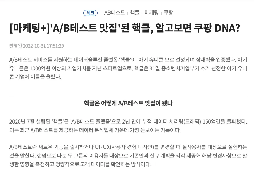 핵클은 로켓배송, 와우멤버십, 쿠팡페이, 쿠팡이츠 등 쿠팡에서 성공적인 서비스를 론칭했던 PO, 개발자, 데이터 사이언티스트로 구성된 스타트업입니다. A/B 테스트를 메인으로 기능 플래그, 데이터 분석 등 제품의 신규 출시부터 고도화까지 데이터 기반 제품 성장에 필요한 모든 기능들을 SaaS 형태로 제공하고 있습니다.